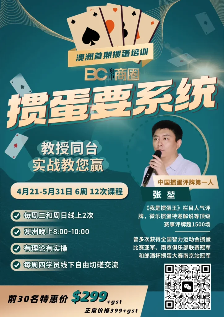 掼蛋有系统,中国顶尖高手陪伴式授课!4月21日至5月31日澳洲独家首期6周12节掼蛋小班课!首期特惠只要 $299!